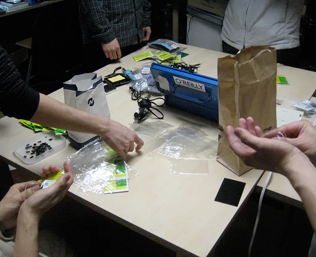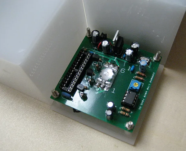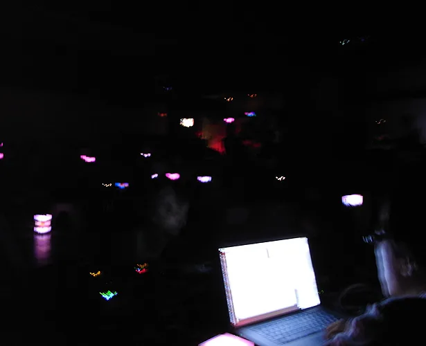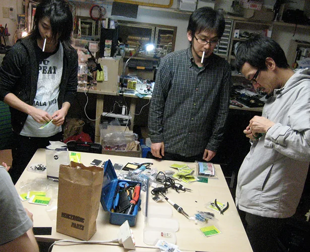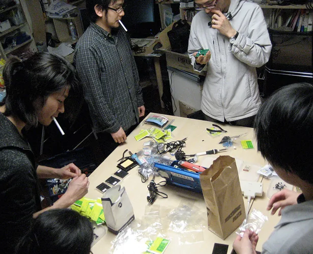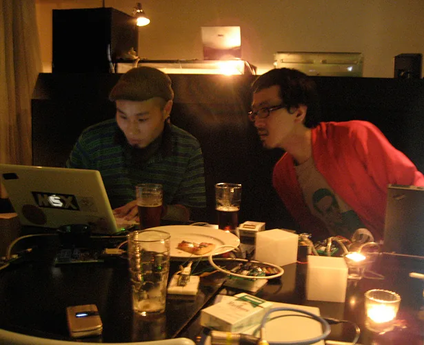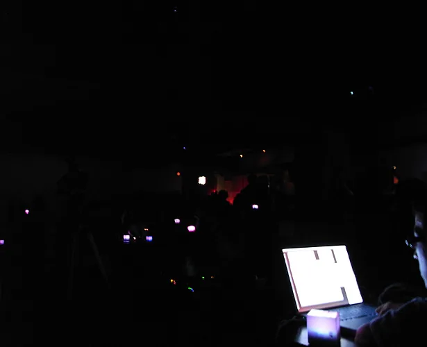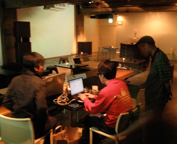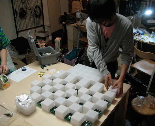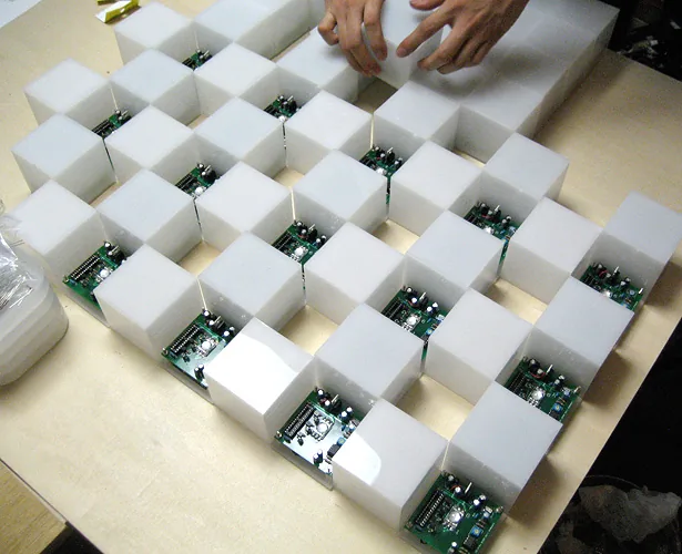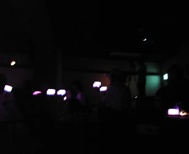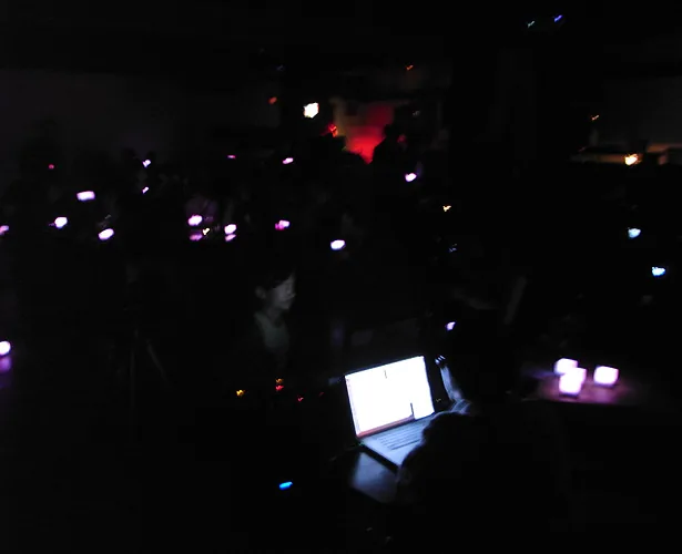 The cube not only glows in response to sound, but also blinks and glows in a curve sometimes, regardless of the sound. How the cube glows can be controlled by sending sound commands. For example, in one scene, the cube blinks regardless of the sound, in the next scene, the cube reacts to low pitch sound and glows red. After that, the cube reacts to low pitch sound by glowing blue, middle pitch sound by glowing green, and high pitch sound by glowing red. Creating the cube object and designing the plan of commands is merely making a platform. There are many possibilities for which this can be presented. If one wants to enjoy such a media work using those commands and exchanging data, usually one needs a computer or a special interface device. However this work only requires speakers, and one can enjoy the results to the full extent. For example, you can input commands to an audio CD and the cube would respond fully to the sound. This work can be played using existing infrastructures.
