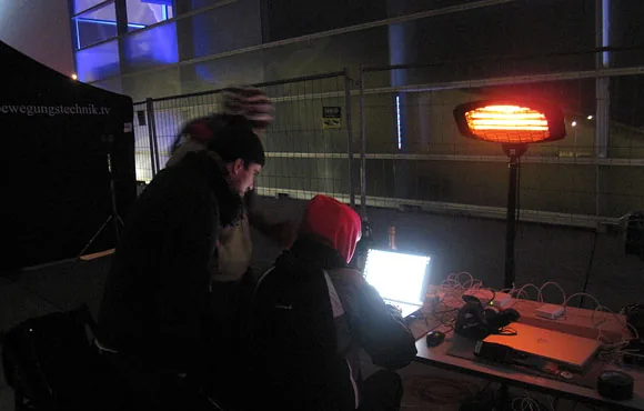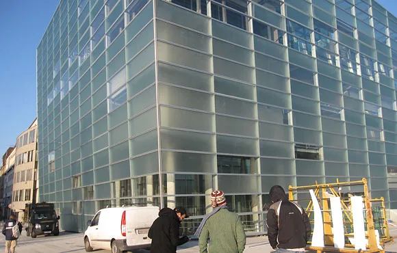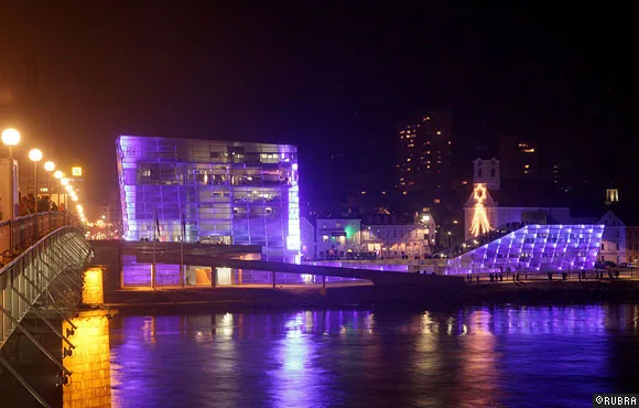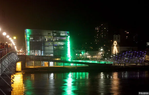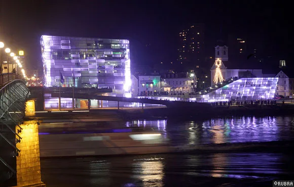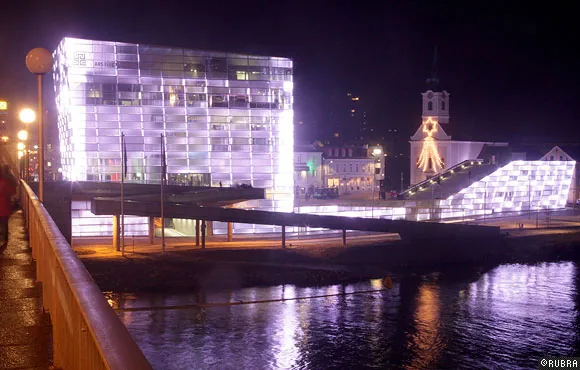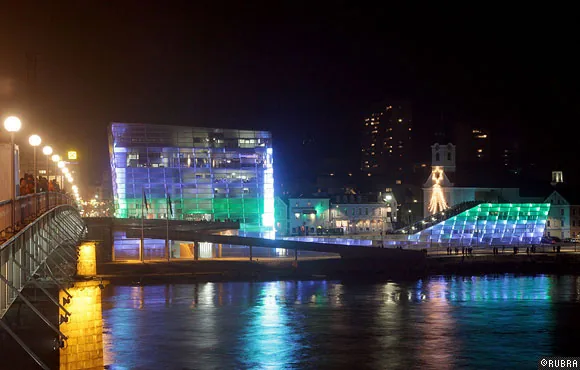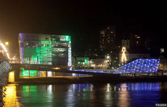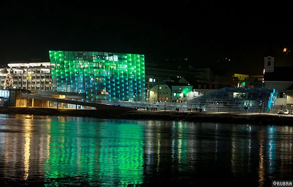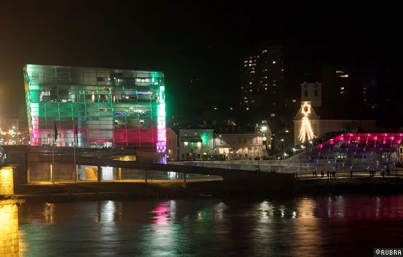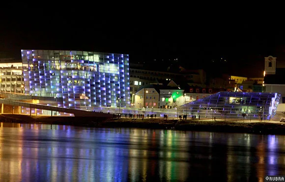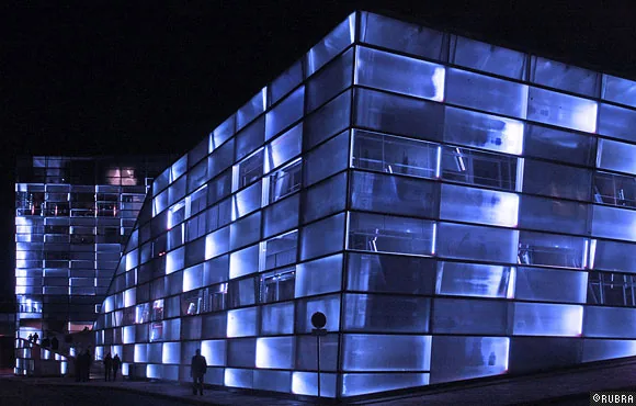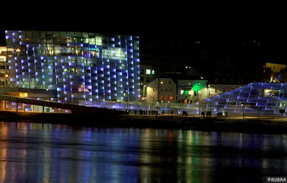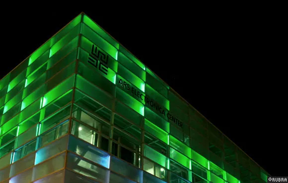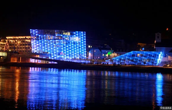 ニューアルスエレクトロニカセンターのオープニングのために行われた、ビルのファサードを使った光と音のパフォーマンス。