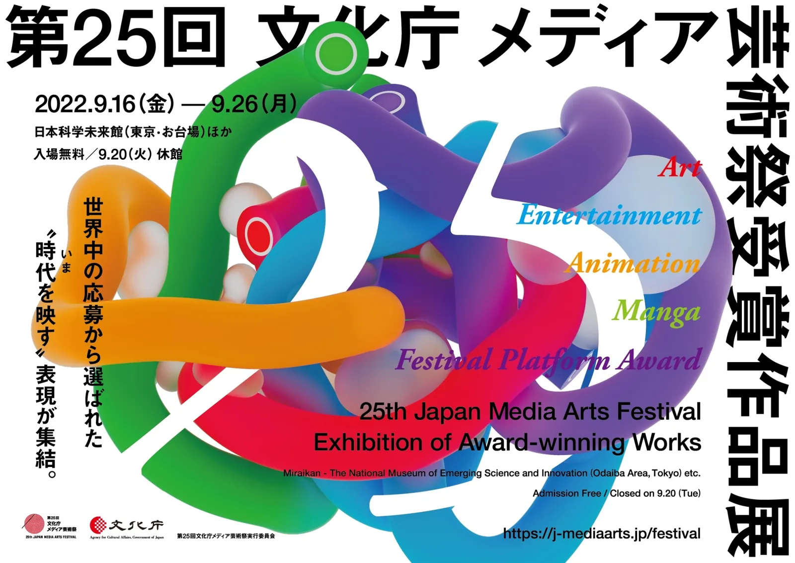 第25回文化庁メディア芸術祭 受賞作品展のキービジュアル/コンセプトビデオを制作。 キービジュアルの成長し変化する多彩なラインは、アート、エンターテインメント、アニメーション、マンガ、フェスティバル・プラットフォーム賞の各カテゴリーが互いに影響しあいながら表現を磨き、時代とともに進化している様子を表している。
