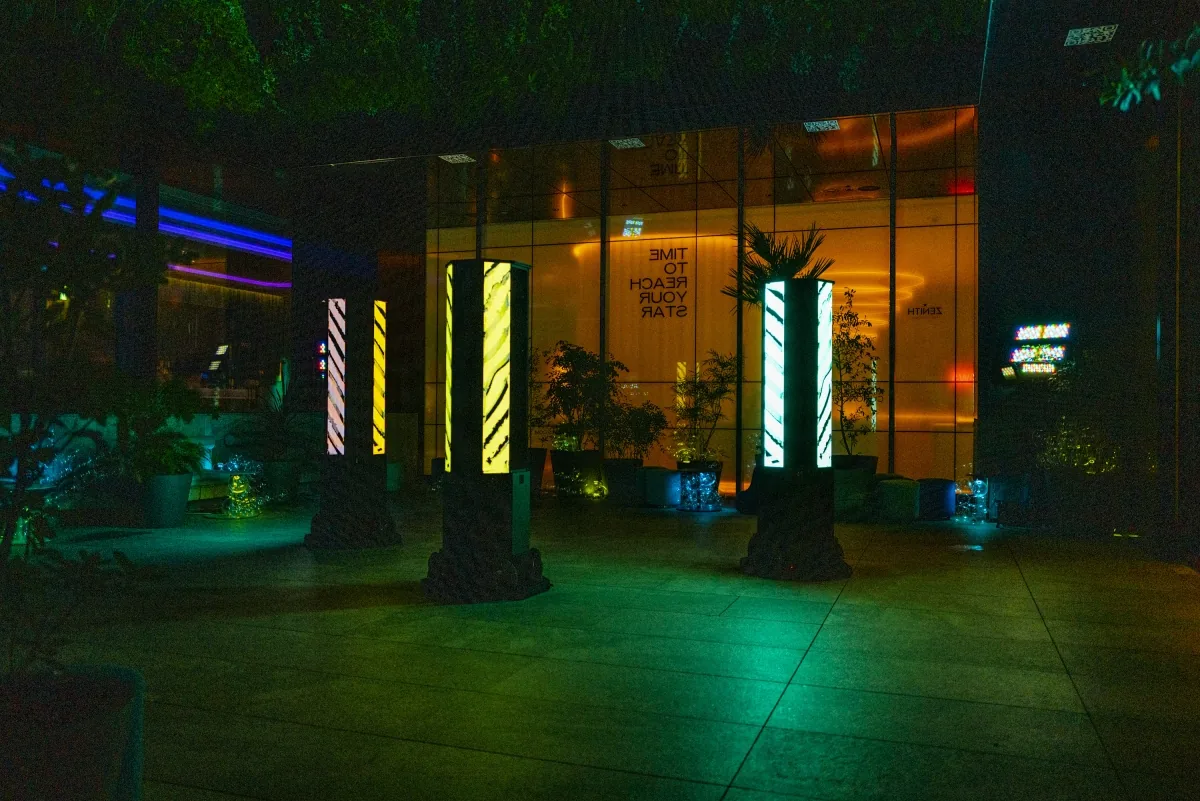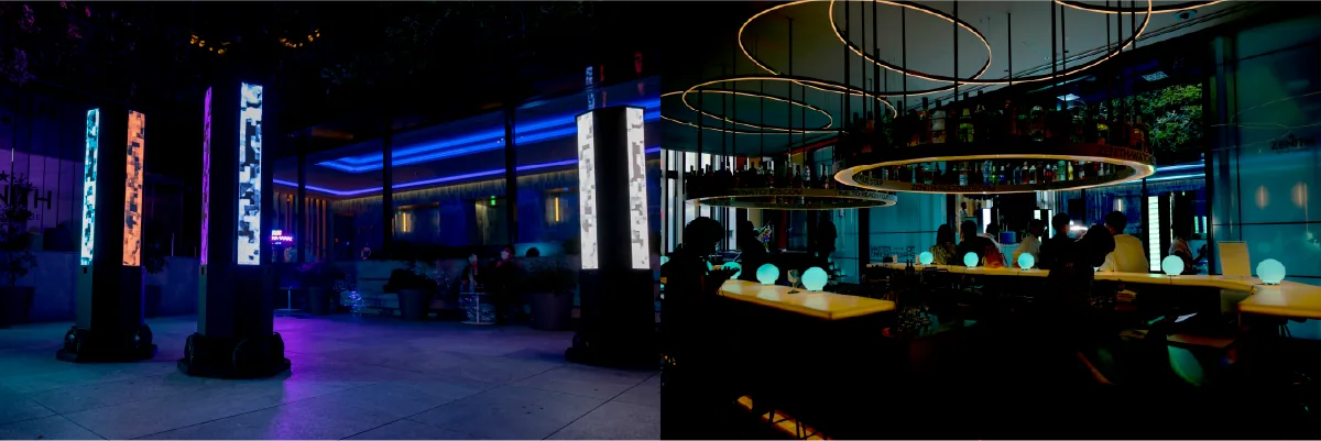 Nosaj Thing x Daito Manabeによるオリジナルの新作サウンドに反応し、高精度に同期して光るデバイスをW大阪の4F中庭部分、バーエリアに約50個設置。また、LED Robot3台が場内を自律走行し、LEDのパターンもサウンドと同期する。会場全体がサウンドに反応するライトインスタレーションとなった。