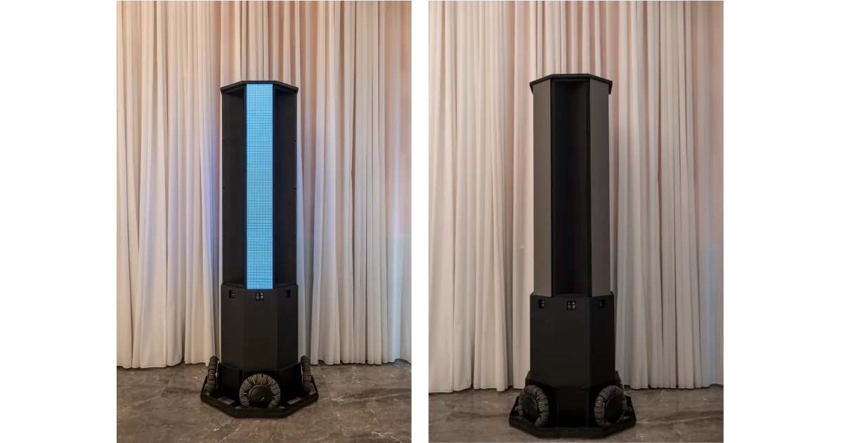 オムニホイールを装着した自律走行ロボットに、4面のLEDディスプレイを配置した。LEDディスプレイは2.5mmピッチの高精細なものを採用。全方位移動が可能なホイールにより、エリア内を自由に動き回るロボットの動きと、絶えず変化する映像演出をどの角度からでも鑑賞することができる。