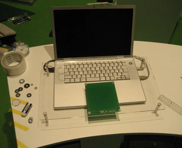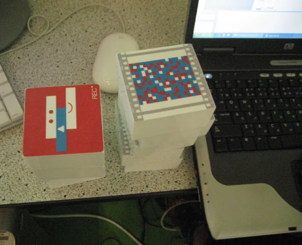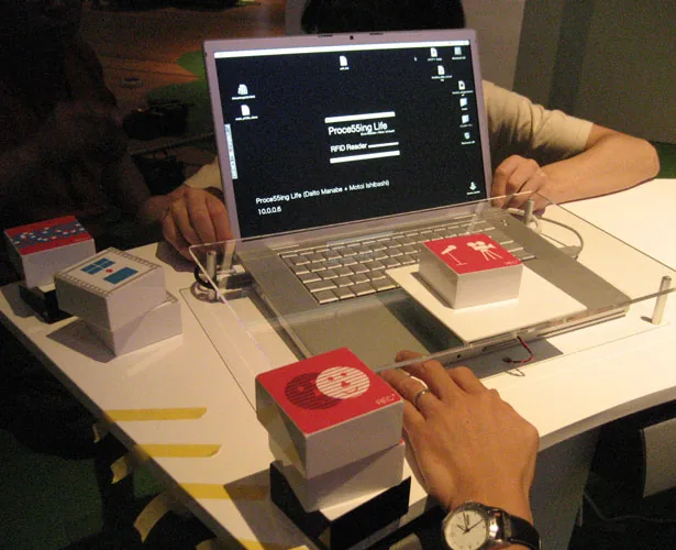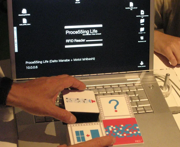 Daito Manabe + Motoi Ishibashi サンプリングした映像と音を再帰的にエフェクトをかけて、そのプロセスの様子を楽しんでもらう事を目的とした作品。 RFタグが内蔵されたブロックを置く事で映像と音のサンプリングと、エフェクトの選択を行う事が出来る。 一台目で取り込んだ映像と音はエフェクト処理をされて、二台目のマシンにTCP/IP経由で送信される。 二台目のマシンでまたエフェクト処理をされて、三台目へ、、と続いて行…