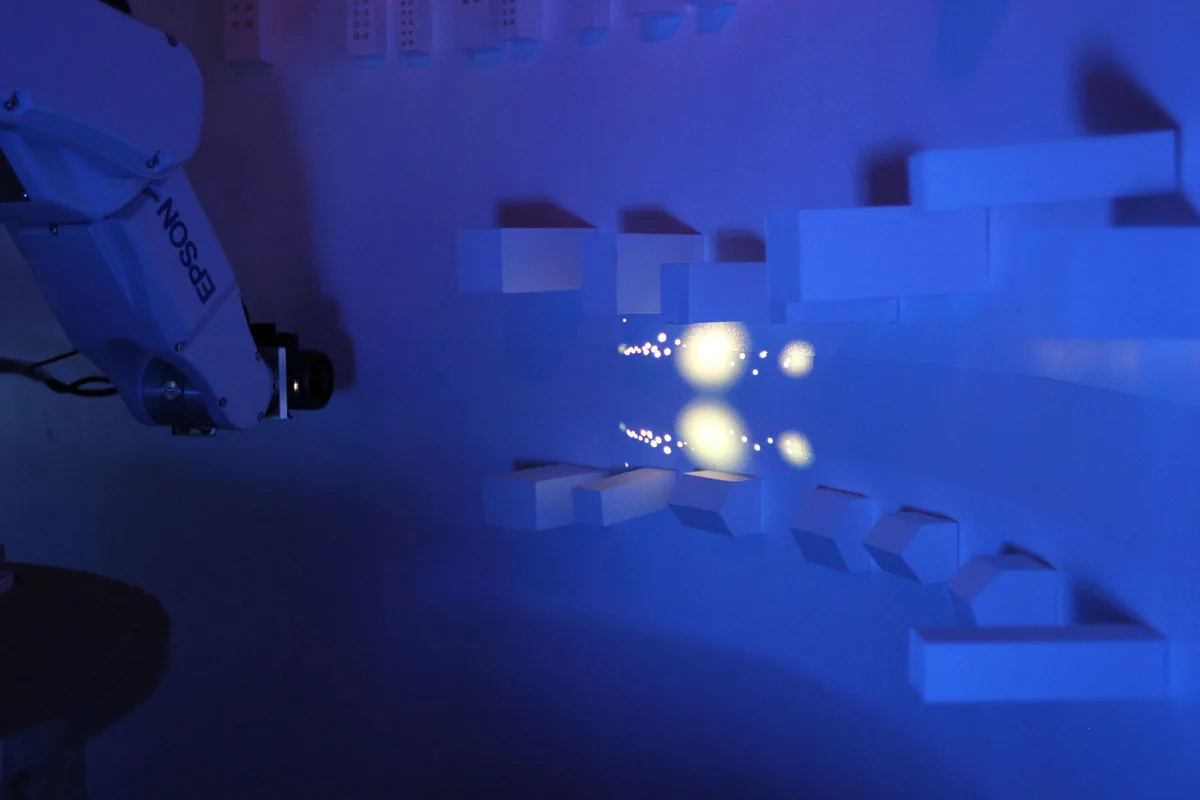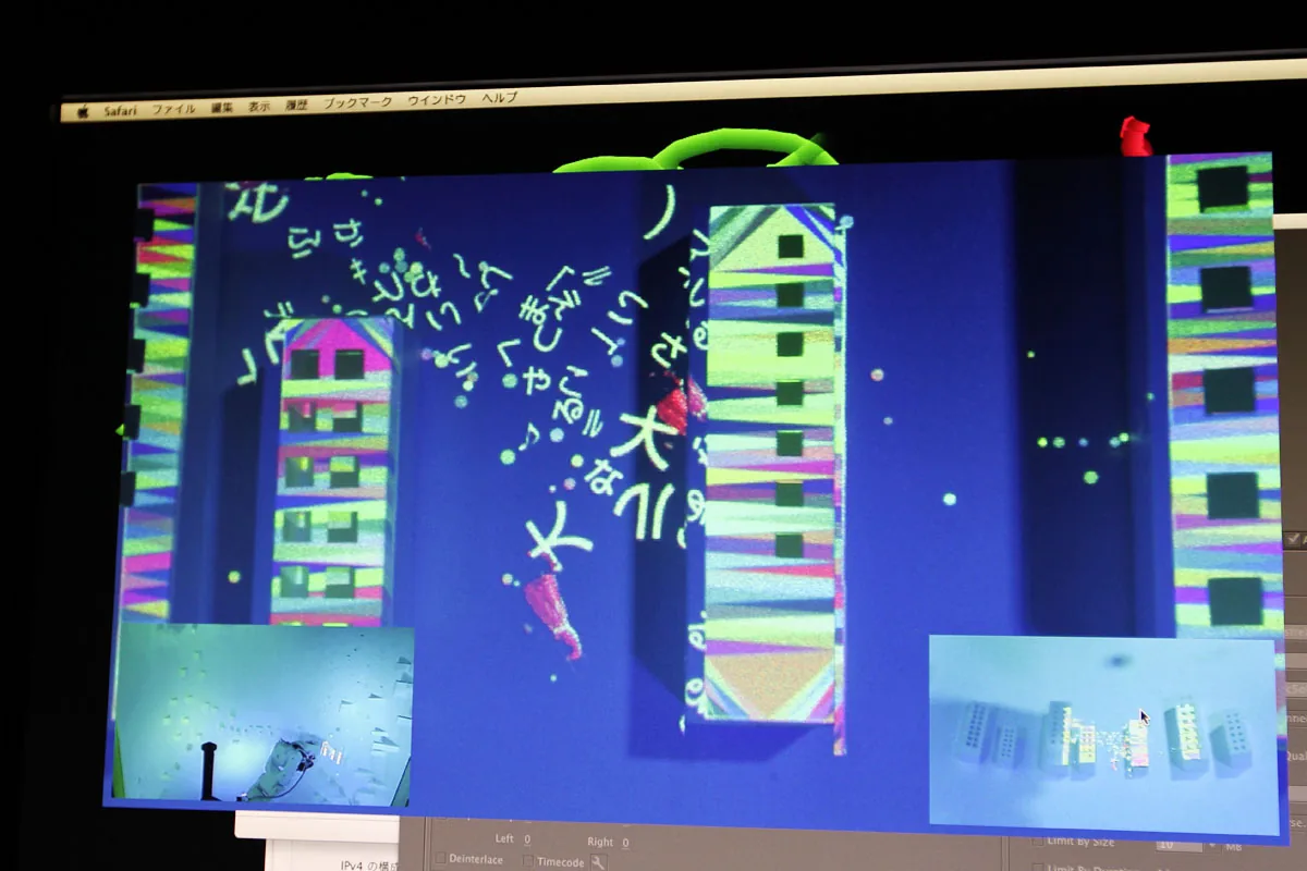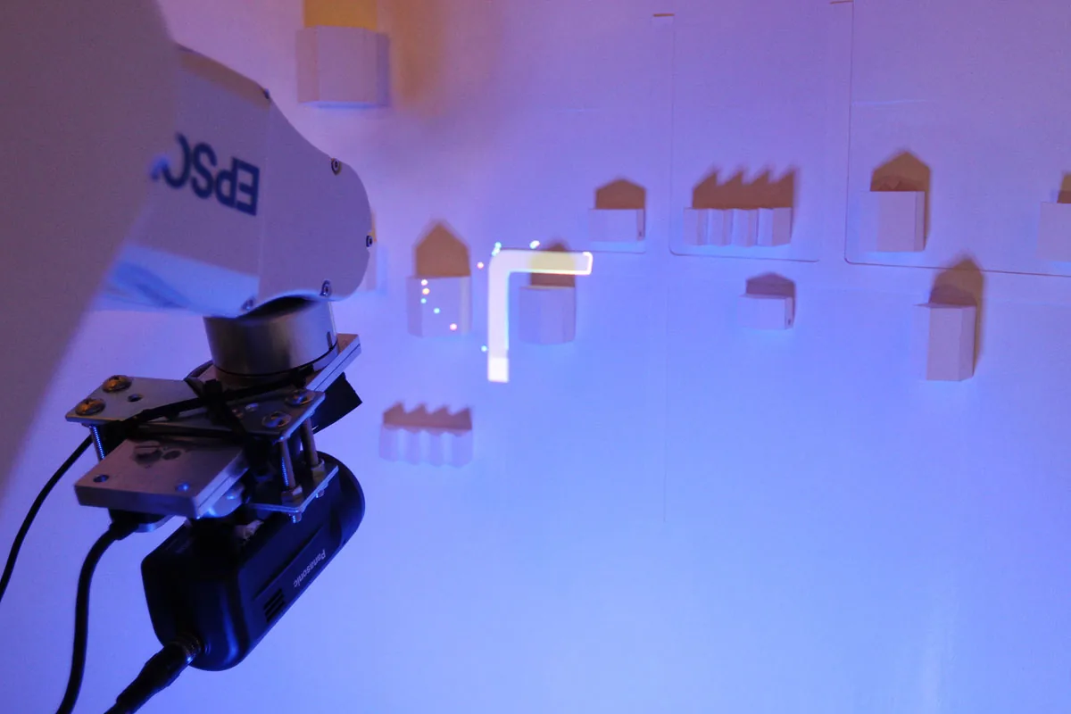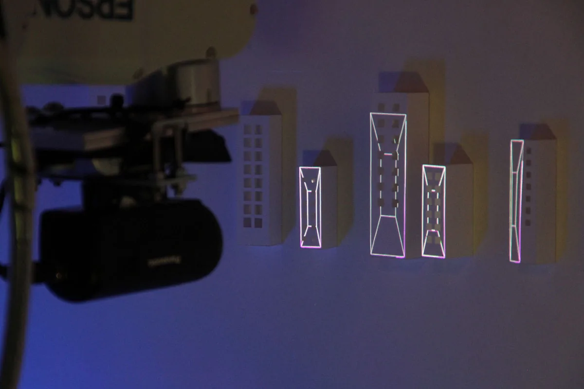 ロボットアームの先にピコプロジェクタとカメラを取付けて ミニチュア模型にプロジェクションマッピングを行ったミュージックビデオです。 事前にトレースしたミニチュア模型の形状を解析し、リアルタイムで映像を生成しているため ロボットアームの移動によってプロジェクションする位置が変化しても 模型へのマッピングがずれることはありません。 静止した物体にプロジェクションするものは 事前に映像の投影位置を調整すれば良いだけですが この様なダイナミッ…