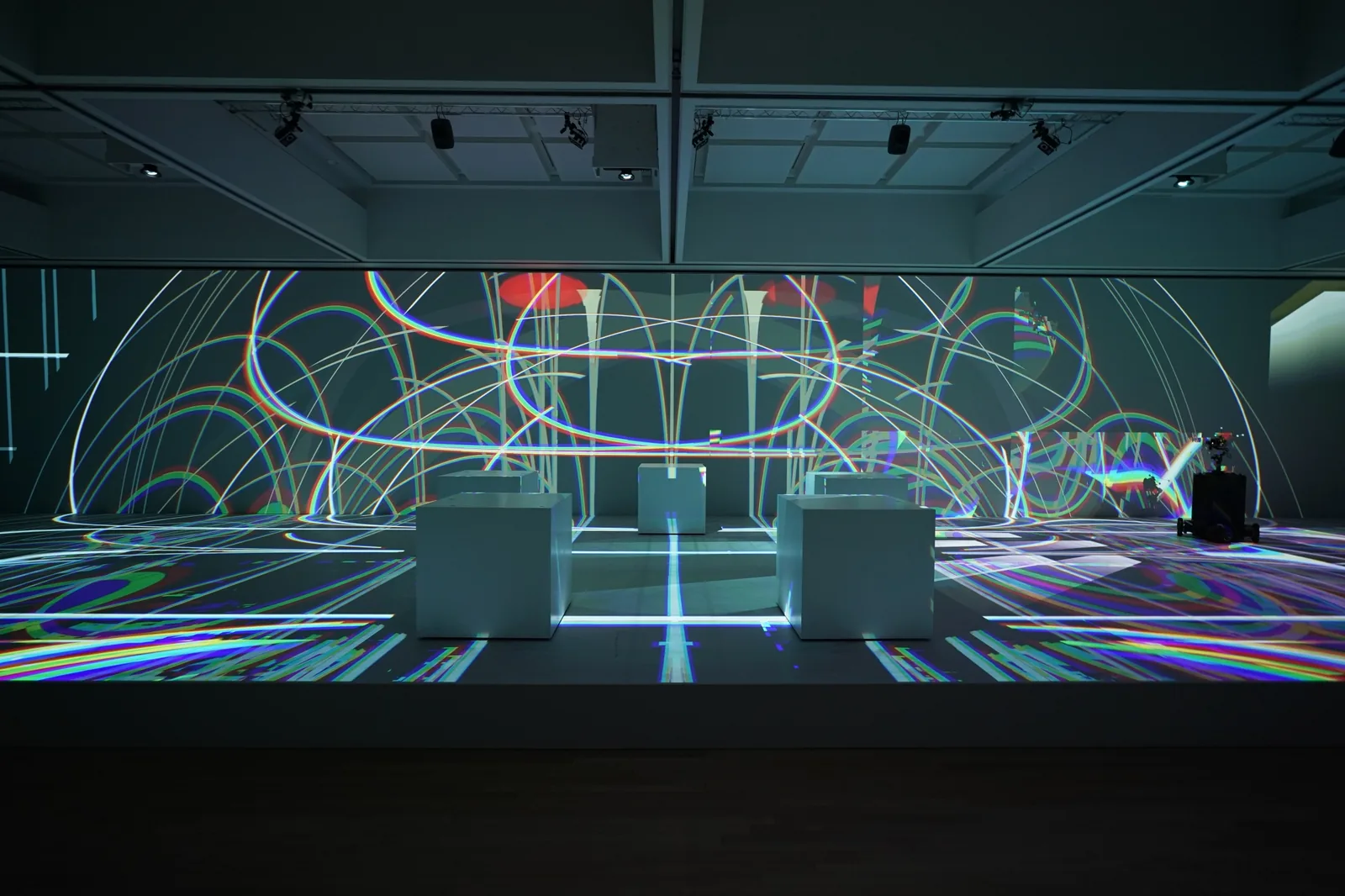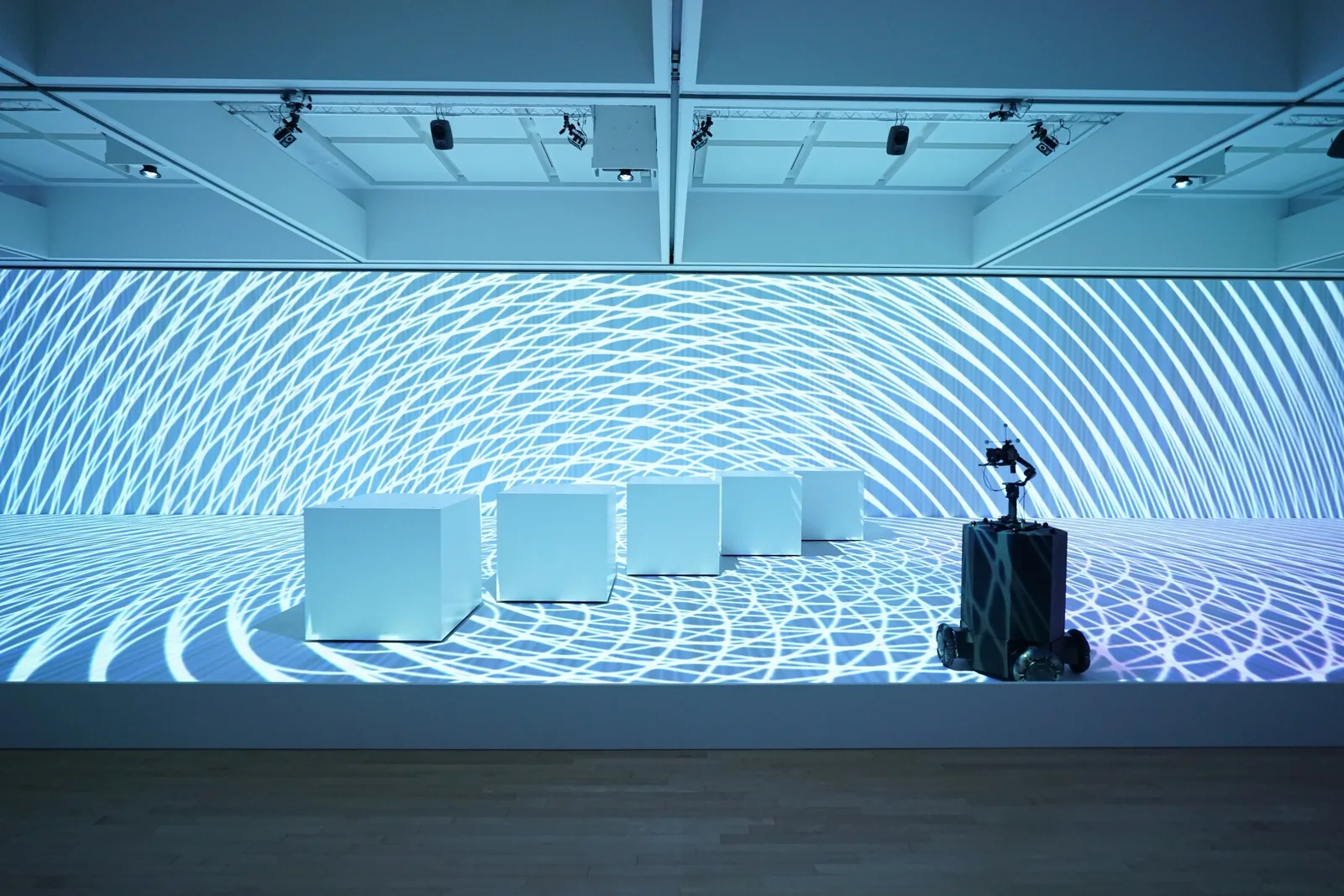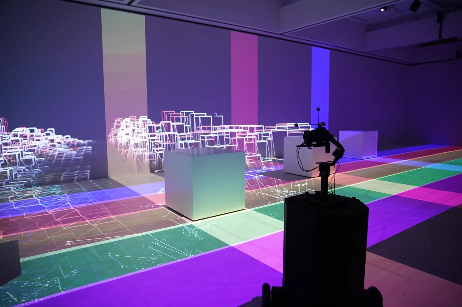 5人のダンサーのモーションデータ、投影映像、移動ロボットを特徴とするインスタレーション。2つの物理的な展示空間とオンラインで展開。現実の表現を仮想空間に単に転置するのではなく、複数の視点から新しい人間性のための環境を創造することを目指したハイブリダイゼーション。 メイン展示空間では、AR合成されたダンサーの投影とともに5つのキューブが自律的に動き回り、自律移動カメラが会場を撮影しながら映像が壁と床に流れていく。 来場者は、映像とモーシ…