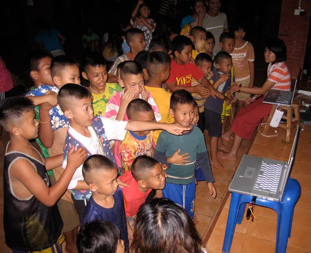 チェンマイ大学の助教授の力を借りて、孤児院にてコンピューターを使ったアートというお題でレクチャーと作品展示を行った。当初開発していた画像解析を用いたプログラムは 大人数ではまったくうまく動かなかったため、現地で子供の動きを見ながらシンプルな映像・音響 サンプリング・カットアップアプリをMaxMSPJitterで制作。1時間以上展示していたが、途切れる事無く子供達が 遊んでいた姿を見て感動。