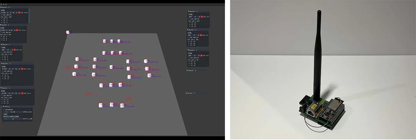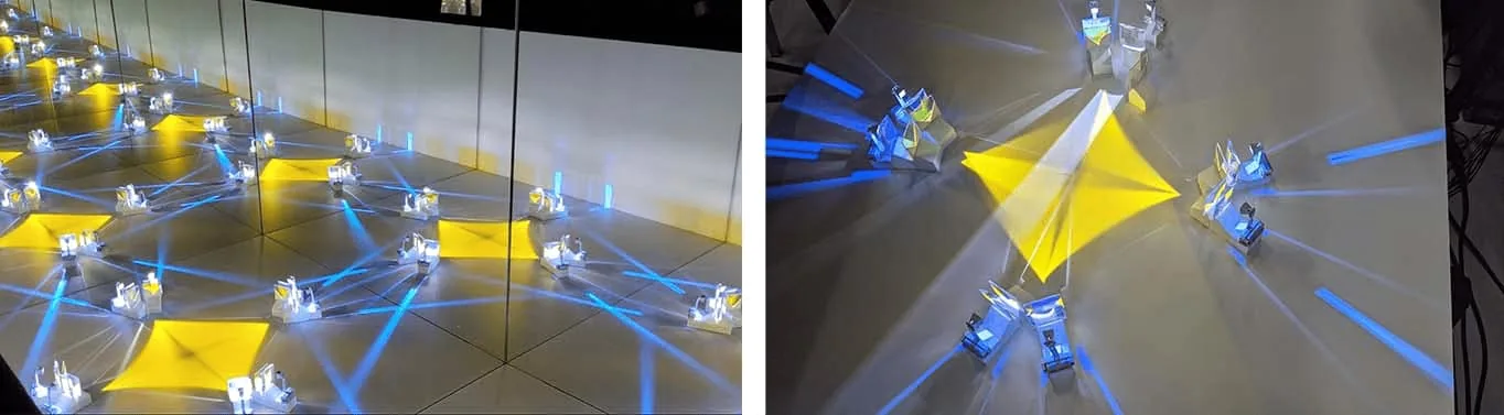 For the autonomous cubes, we adapted the toio™ Core Cube, a toy robot made by Sony Interactive Entertainment. We modified each cube with a variety of “gimmicks.” While the cubes thus each played an independent role, the system was customized so that these individual movements were oriented in service of a unified goal. We created a transceiver device that regulated this cube fleet via Bluetooth. In the final scene of the video, the cube fleet moved into just the right configuration such that the light was manipulated to project the Yokogawa logo on the floor.