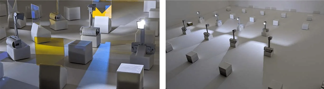 Polarizing filters were used to block out blue light and convert the spotlight beams into the yellow Yokogawa logo. The cubes were also outfitted with V-shaped masks that created the rhomboid logo’s sharp points.