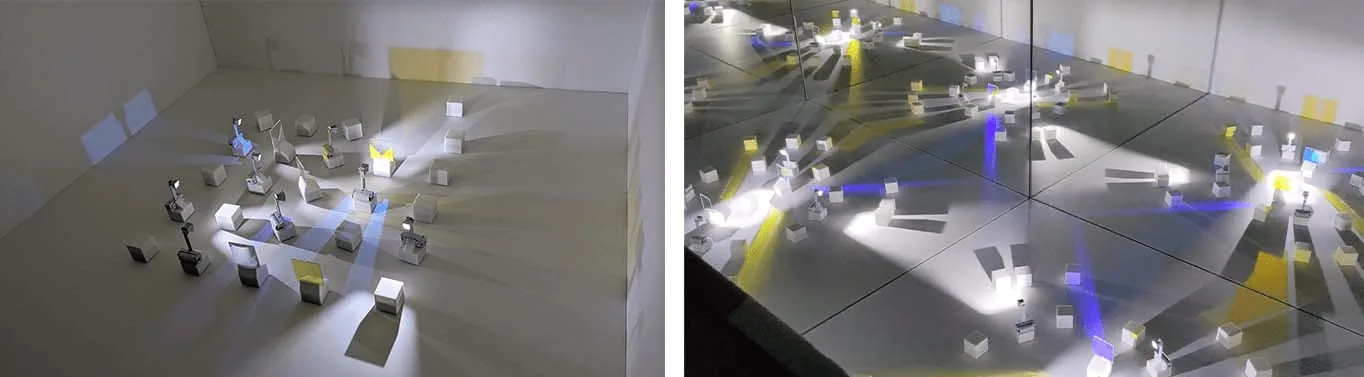 Although these cubes did not appear on screen in the finished video, they were equipped with cameras used to film a portion of the scenes. Having the cameras themselves move as part of the system enabled us to dynamically capture the action from the perspective of the cubes.