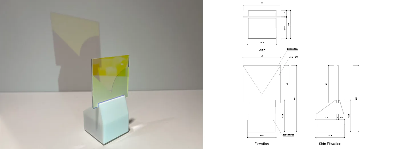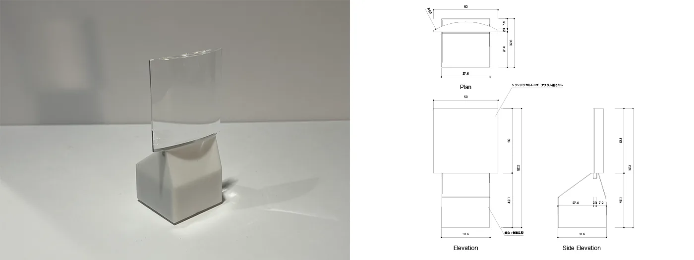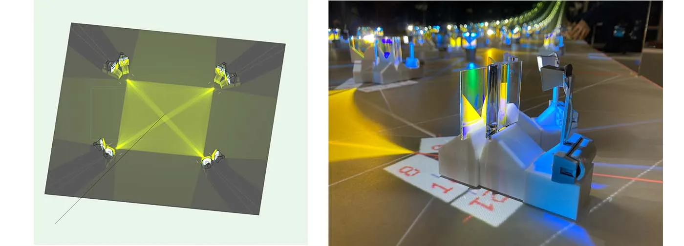 Left: CG verification of the lens condenser and filter effects , Right: Gimmick cube placement per the simulation