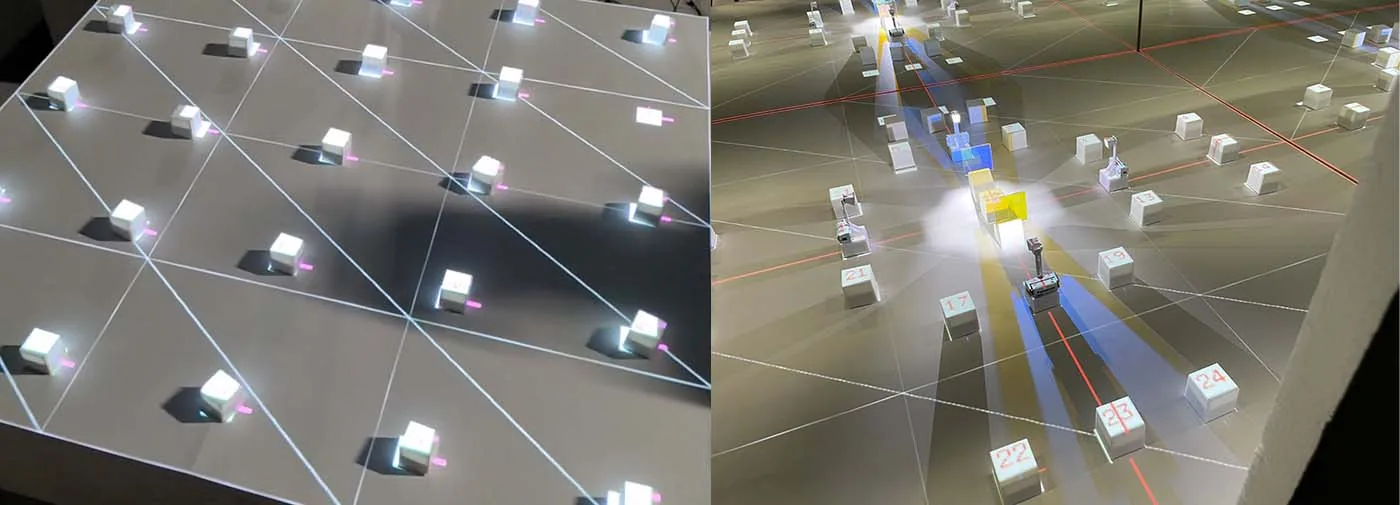 CG software was used to evaluate camera angles, cube number, grid size, and create video content. Based on this data, we sequenced the movement of the 25 individual cubes in a CG simulator. We also developed a framework that facilitated control of cube movement, rotation, and speed via Bluetooth by replaying the CG simulator in real-time when filming the video. The system accommodated projections to guide filming and the ability to export the sequencing used in the synthesis of AR scenes.